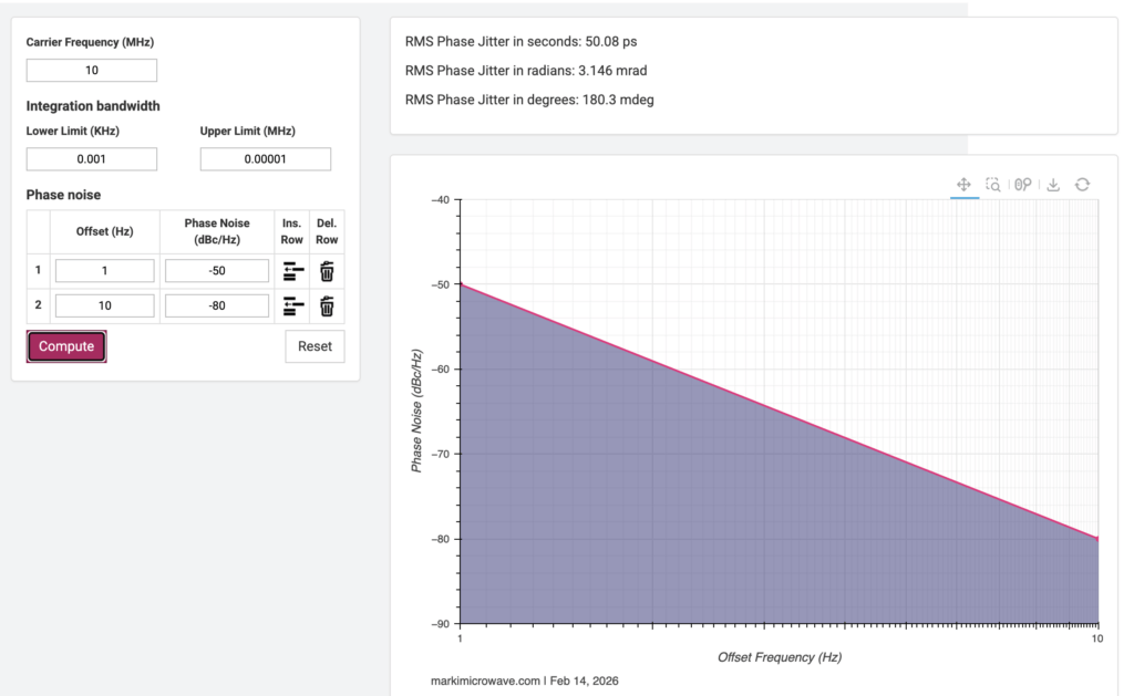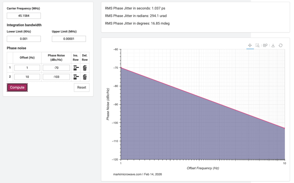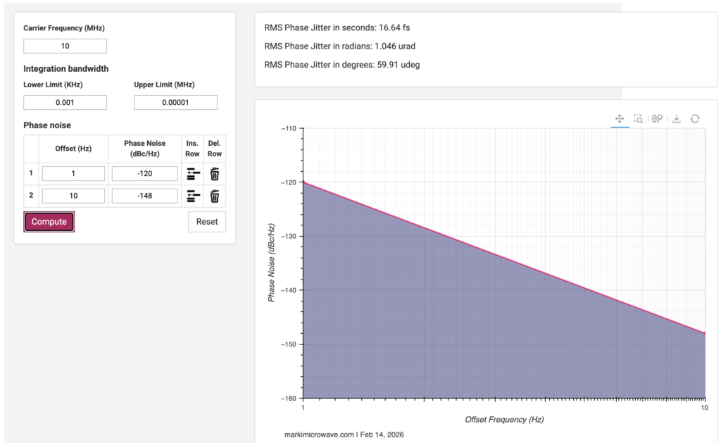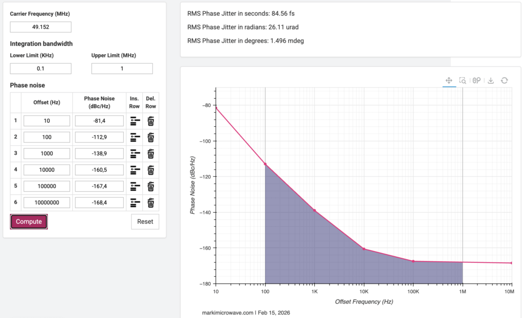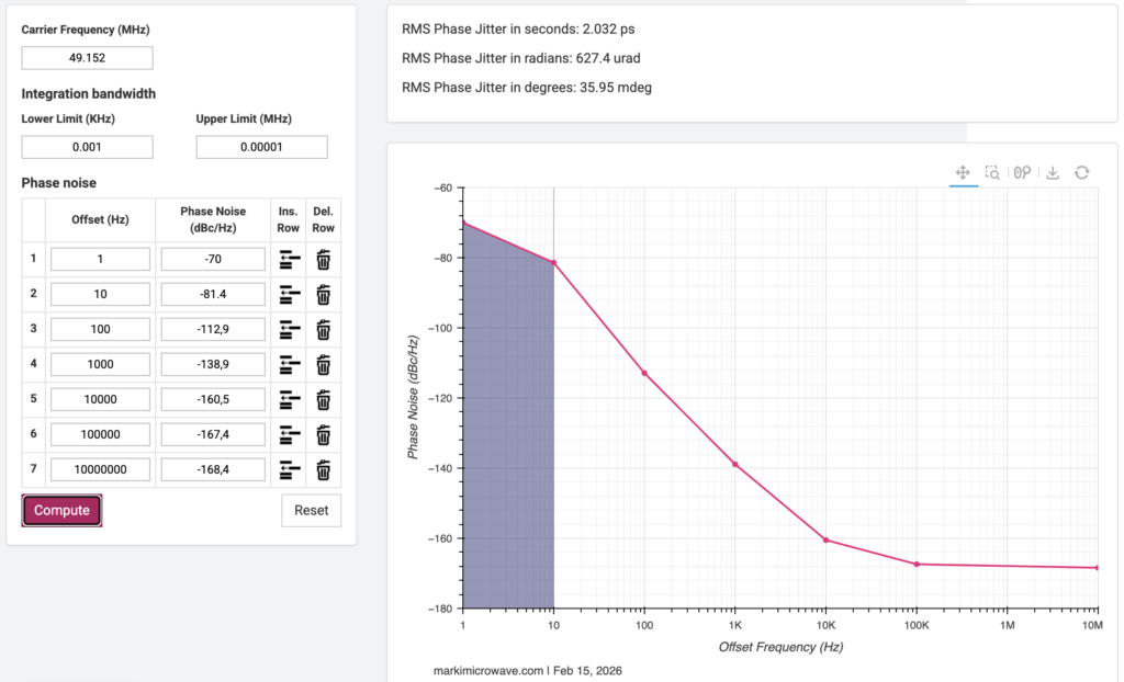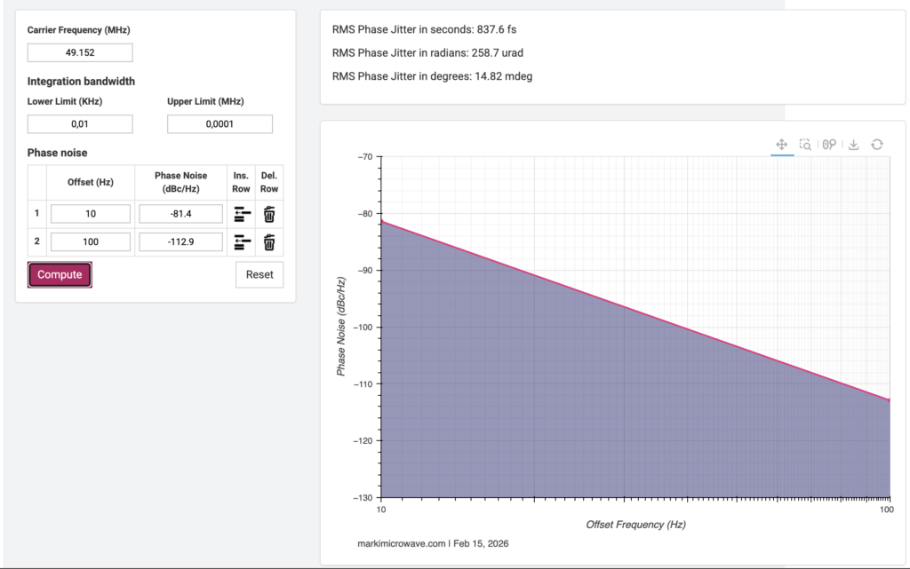 Mit dem im Web verfügbaren Phase Noise to Jitter Calculator von Marki Microwave ist eine einfache Berechnung möglich. Man gibt einfach die Phasenrauschwerte ein und bekommt das Ergebnis. Hier muss man auf die Maßeinheiten achten: