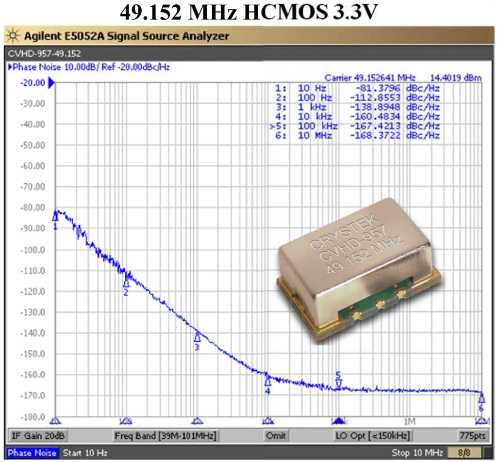 - das Phasenrauschen bei 1 Hz mit ≤ -120 dBc/Hz sehr niedrig ausfällt.