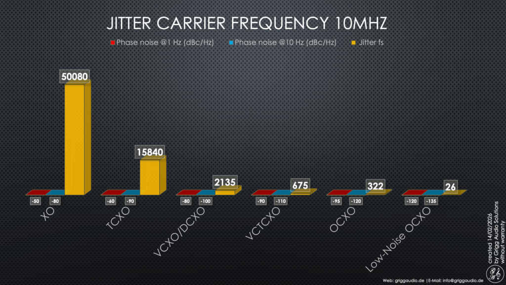 Bei den Clocks kommt es auf den Phasenjitter, beziehungsweise das Phasenrauschen im Bereich 1 Hz bis 10 Hz (Wander) an. Wander ist als niederfrequenter Jitter laut Upton Audio ziemlich tückisch, weil das Phasenrauschspektrum der eingehenden Daten das Phasenrauschspektrum der lokalen Clock (Empfänger Clock) überlagert. Es kann nicht durch Pufferung oder Lichtwellenleiter aufgehalten werden und beeinflusst im DAC über die Massefläche dessen Taktpins.